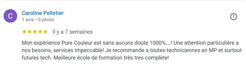 J’adore l’expérience avec l’équipe Pure Couleur! Les meilleurs formations au Québec! Le but de Chantale n’est pas donner des diplômes, mais plutôt de te rendre professionnelle et en confiance. Tu es accompagné comme un enfant qui apprend à écrire, jamais vu cela ailleurs.